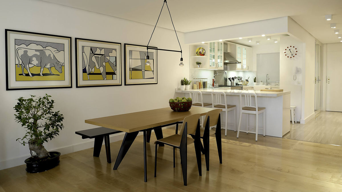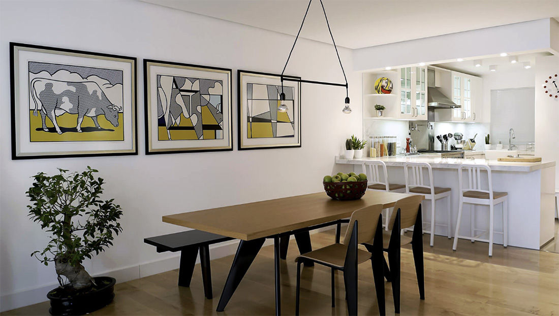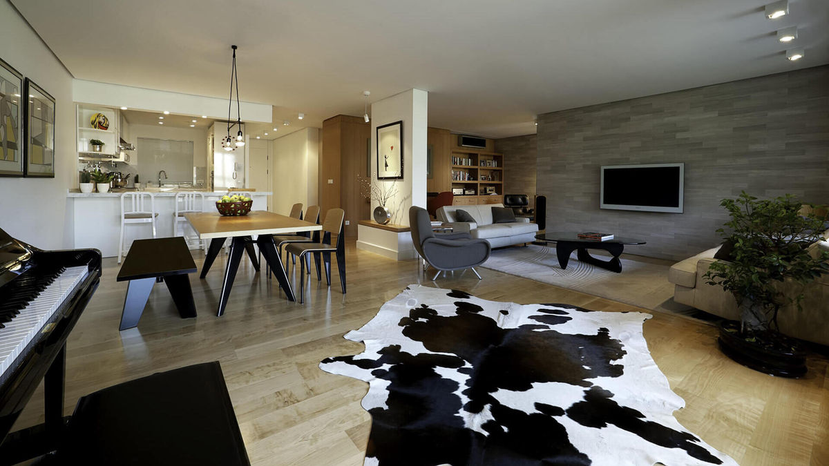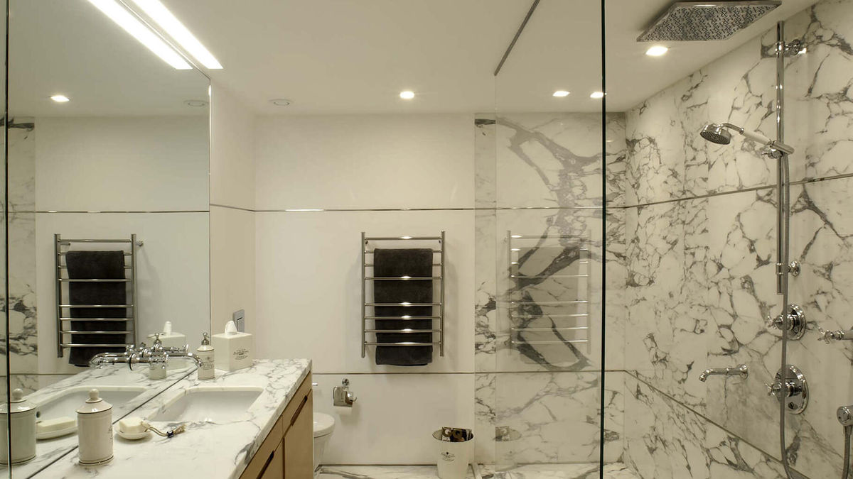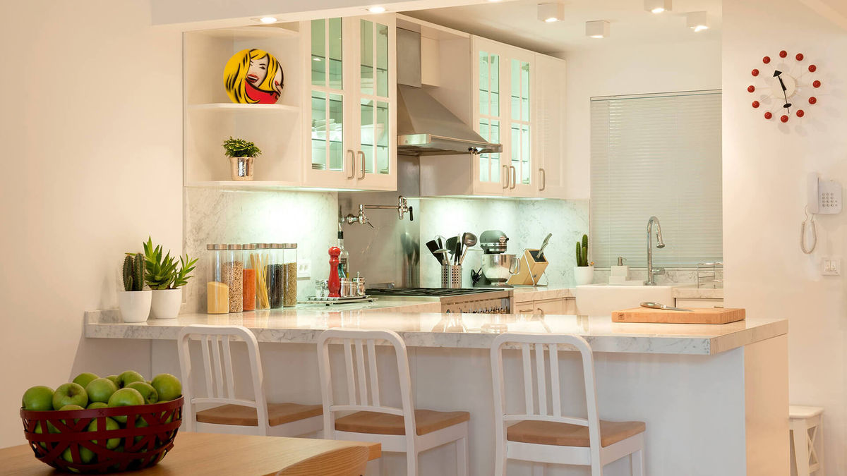 We took a Mid-Century Modern design approach to this full refurbishment project and converted the residence into a one-bedroom plus den bachelor unit -- replete with beechwood flooring; double-shower arabescato marble bath; an open kitchen with pedal faucet and stainless-steel pot-filler, Smeg appliances, and under-counter freezer; and natural stone TV wall.